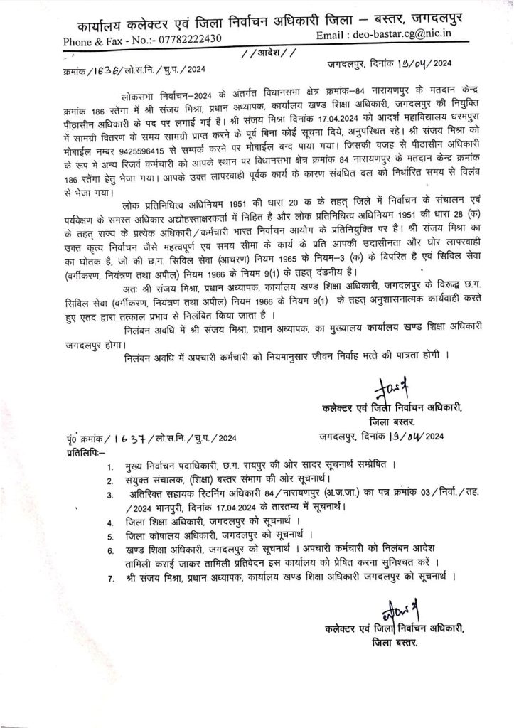 चुनाव ड्यूटी में लापरवाही बरतने वाले शिक्षा विभाग के तीन कर्मचारियों पर कलेक्टर और जिला निर्वाचन अधिकारी ने की कार्रवाई