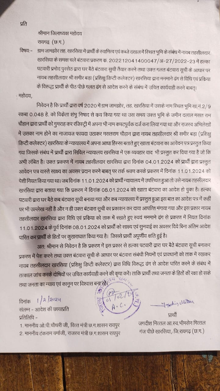 पटवारी ने गलत बटवारा सूची की तैयार नायब तहसीलदार ने विधि विरुद्ध किया आदेश ,प्रार्थी ने कलेक्टर से की शिकायत