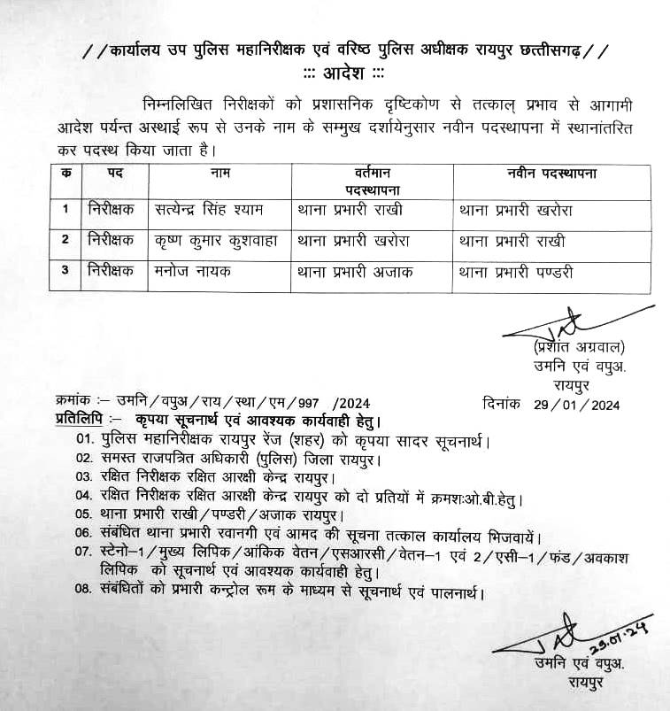 रायपुर में तीन थानों के बदले प्रभारी,आदेश जारी