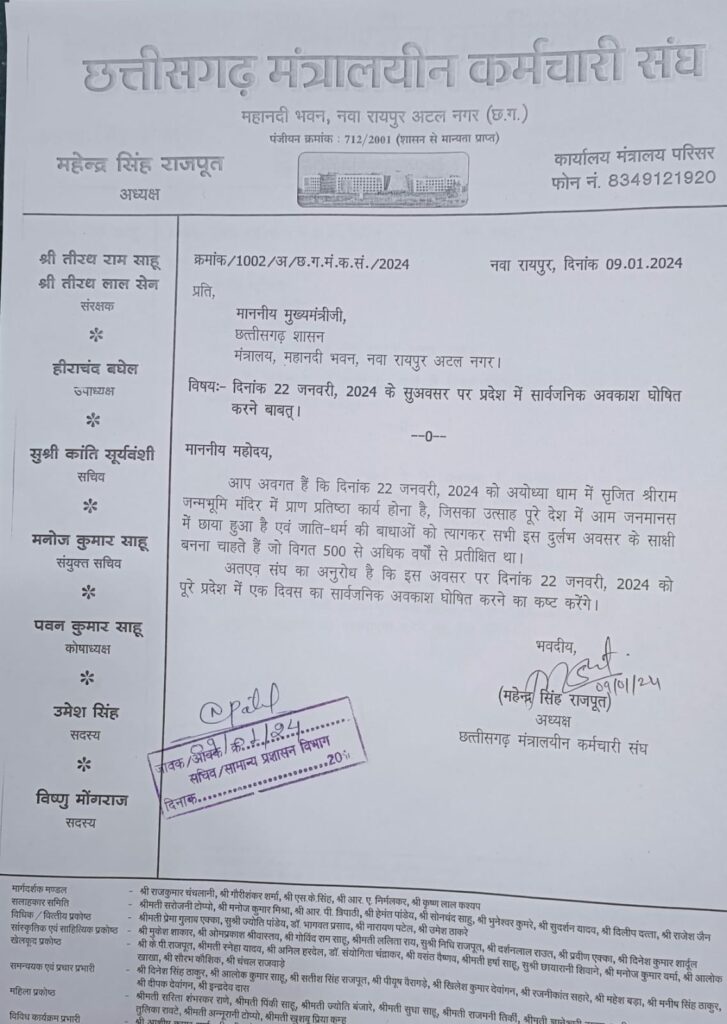 कर्मचारी संघ ने की 22 जनवरी को सार्वजनिक अवकाश घोषित करने की मांग, सीएम को पत्र लिखकर कही ये बात