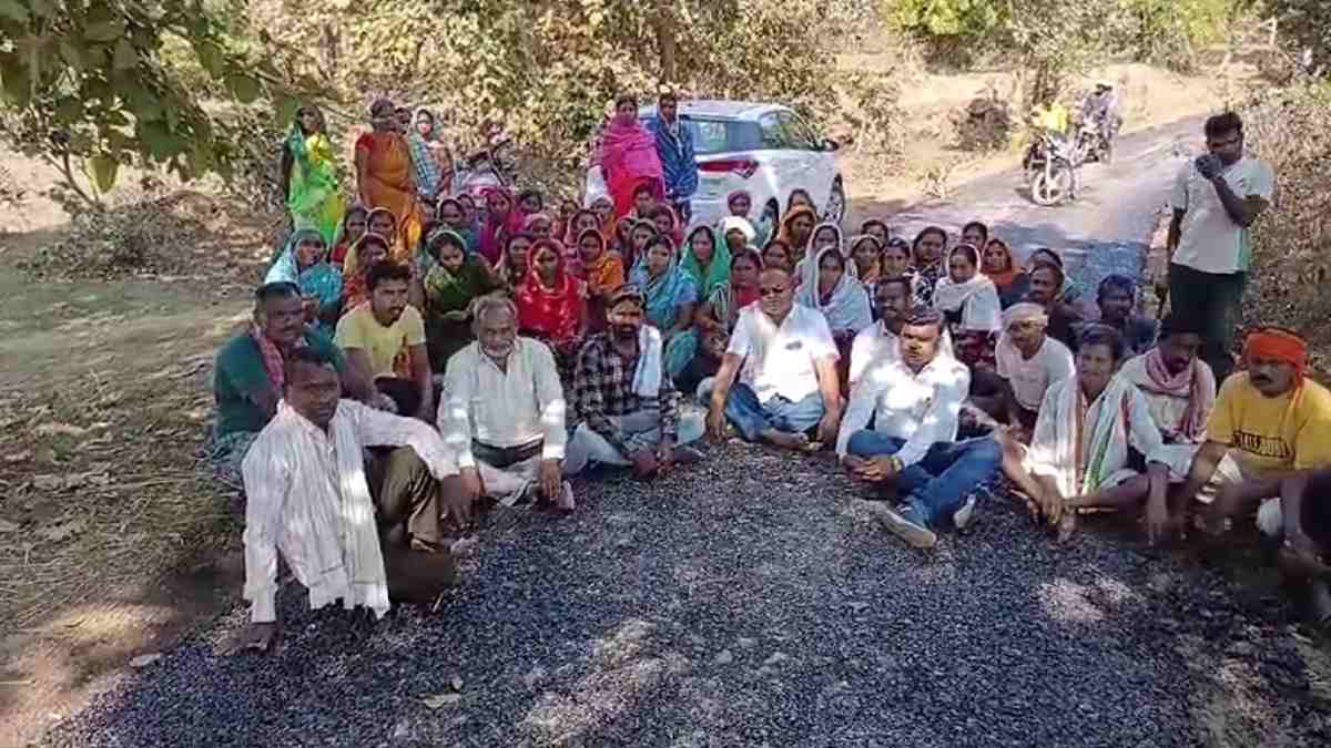 सड़क निर्माण कार्य में अनियमितता को लेकर ग्रामीणों ने सड़क पर बैठकर ठेकेदार के विरोध में प्रदर्शन किया